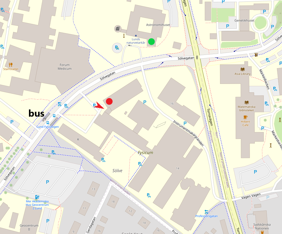 The Physics Department is within walking distance of the train station (Lund C) and city centre. Another option is to take City Bus 7 to Lund Fysiologen, the bus stop is exactly in front of Physics Department.